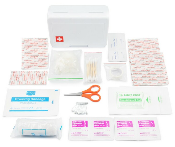 Ensiapulaukku muovikotelossa, sisältä: laastari 72x19 mm (10 kpl), laastari 56x19 mm (5 kpl), laastari 40x10 mm (5 kpl), laastarit Ø22 mm (5 kpl), joustavat laastarit 76x38 mm (2 kpl), alkoholityynyt 3x6 cm (2 kpl, 5 kpl) kpl), kuitukangasteippi 1,25 cm x 4,5 m (1 kpl), PBT-side 7,5 cm x 4 m (1 kpl), sakset (1 kpl), antiseptinen puhdistusliina 2x20 cm (4 kpl), vanupuikkoja (10 kpl/pussi), hakaneulat (10 kpl), kertakäyttöiset haavasidokset (10 kpl) PC)